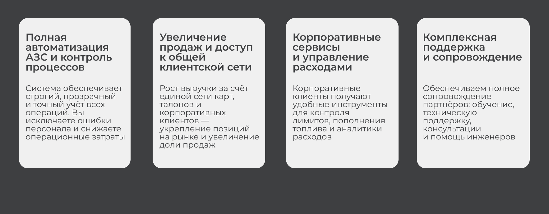 Корпоративные клиенты получают удобные инструменты для контроля лимитов, пополнения топлива и аналитики расходов